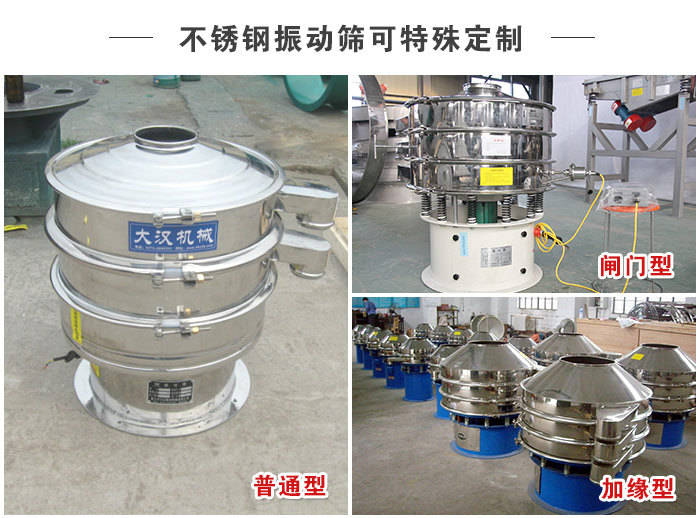 不锈钢振动筛可按特殊需求特殊定制,是否需要特殊设计定制,如“加缘型、闸门型、密封型,或是框体、底座加高,进料口加料斗等,满足客户因场地大小高低配套使用的不同需求。